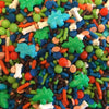This dinosaur sprinkle mix is the perfect topping for a dinosaur cake. It's a delicious blend of blue, green, brown, and orange jimmies, sugar pearls, and sanding sugar, with bright orange dinosaur sprinkles for extra character. Make your cake roar!